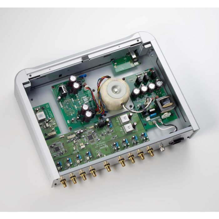 Se adopta una fuente de alimentación de nuevo diseño para maximizar el rendimiento de los nuevos «Amplificadores de búfer de reloj de amplio rango», con el amplificador y la fuente de alimentación divididos en bloques para garantizar que la unidad sea limpia y potente. Se utiliza un transformador toroidal como transformador principal y un transformador de núcleo. El dedicado se utiliza para el control. Se utiliza una serie de condensadores múltiples para el circuito de filtro de ondulación y se utilizan diodos de barrera Schottky para una respuesta rápida para admitir un procesamiento digital rápido.