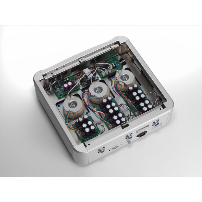 La unidad de control basada en lógica, que gestiona el funcionamiento y la visualización, está integrada en la fuente de alimentación y aislada físicamente de la unidad principal. Además, todas las señales de control que conectan la unidad de alimentación/control a la unidad principal están aisladas eléctricamente de los circuitos de audio mediante un gran circuito aislador, lo que garantiza una reproducción de sonido pura.