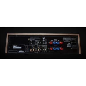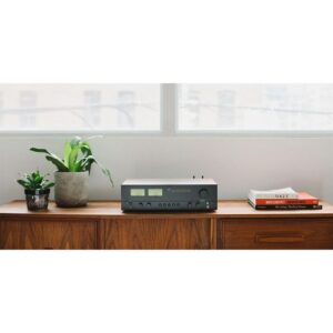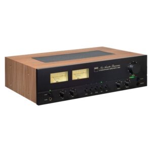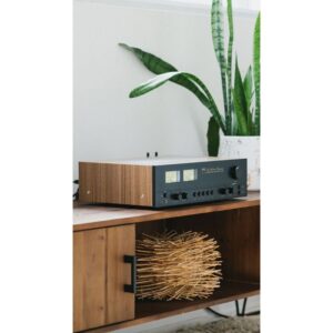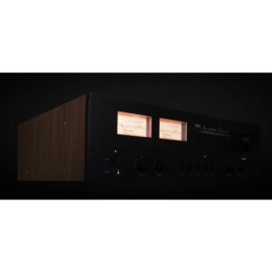 - Los elementos de diseño retro incluyen vúmetros en el panel frontal, controles de entrada mediante pulsadores, marca en cursiva de los años 70, carcasa revestida de vinilo con acabado en nogal y panel frontal gris oscuro.